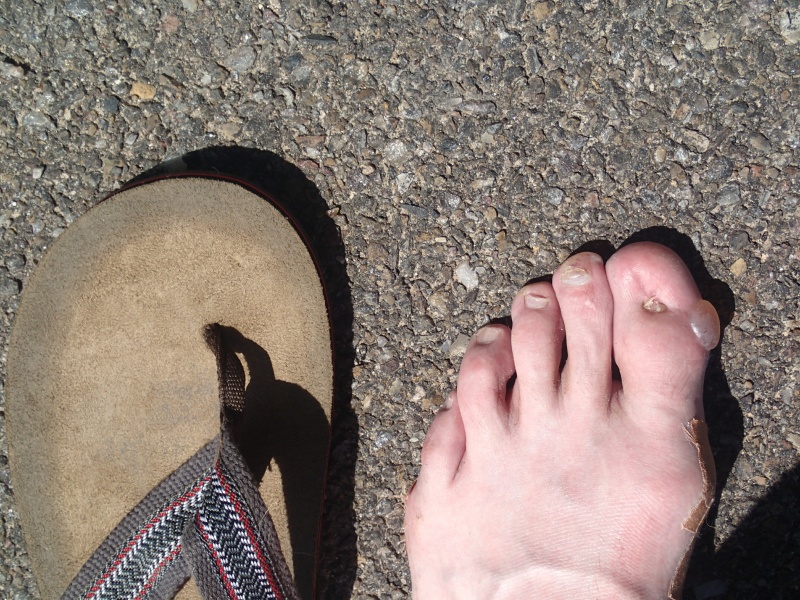 Map | Spectacular blister on the big toe, didn't even know I had it until I took off the shoe. No pain at all. It was fine until the next morning, when one of our dogs stepped on it and burst it. Owe!