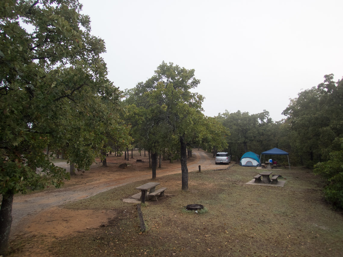 The campsite Saturday morning. No one else around. We heard coyotes howling in the night and several pairs of Barred Owls were calling.