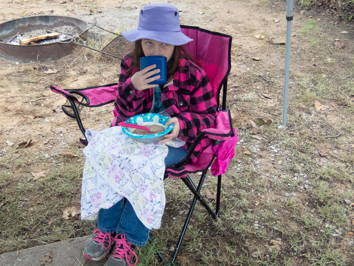 A hot breakfast makes a cold, wet morning morning more bearable. Bacon, eggs, oatmeal and hot chocolate.